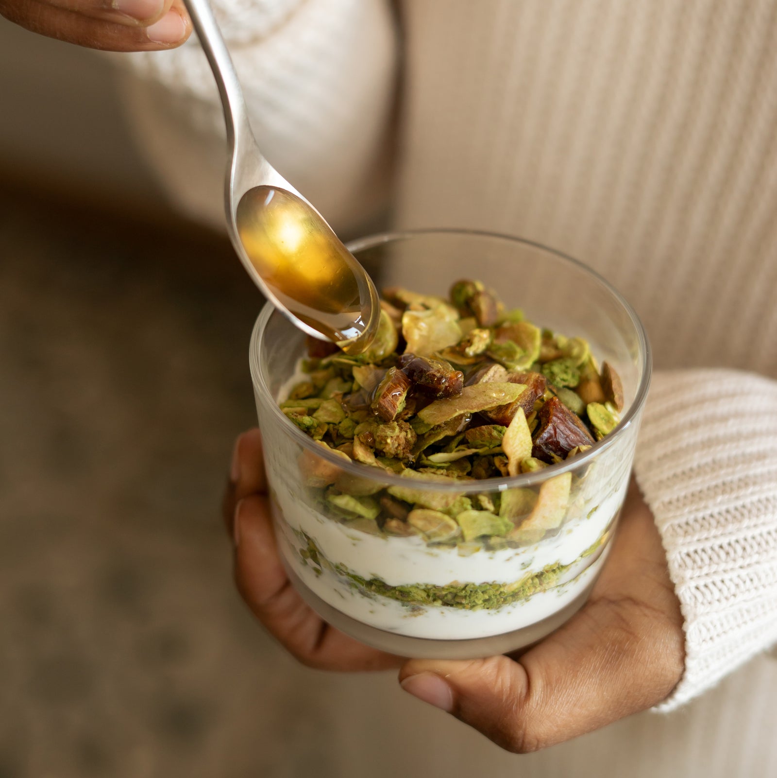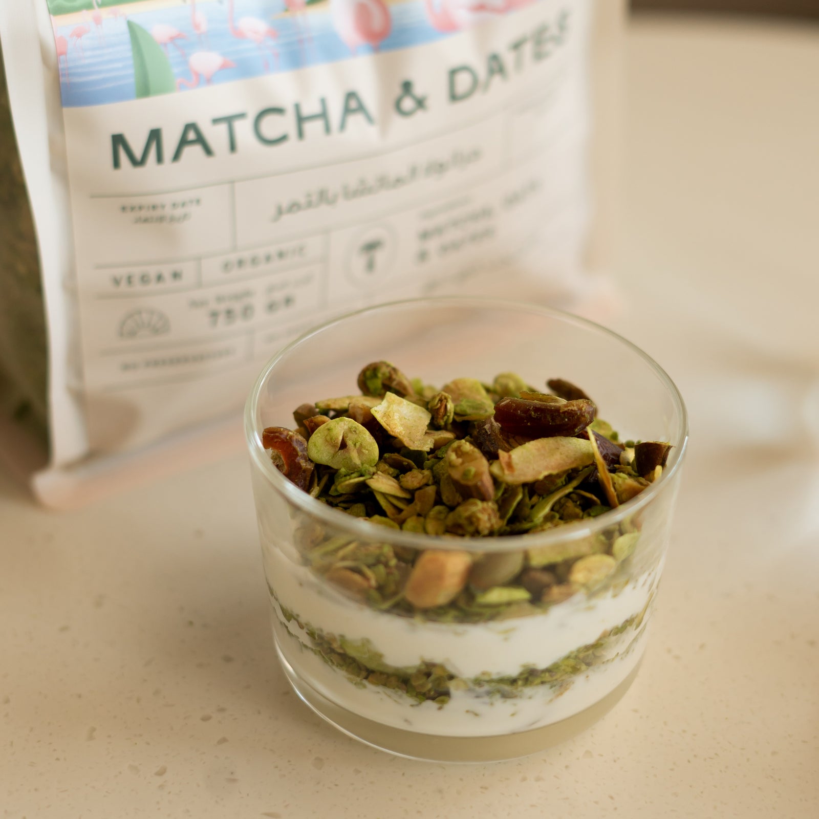 Unique granola mix and flavor using premium organic Matcha and dates.